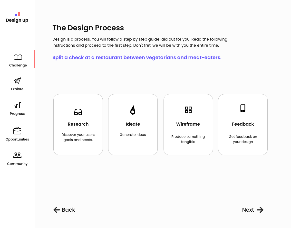 We wanted our app to be hands-on and our design challenges emulate a combination of hackathons and daily UX challenges. These challenges motivate our users to practice and learn skills simultaneously through experiential learning.