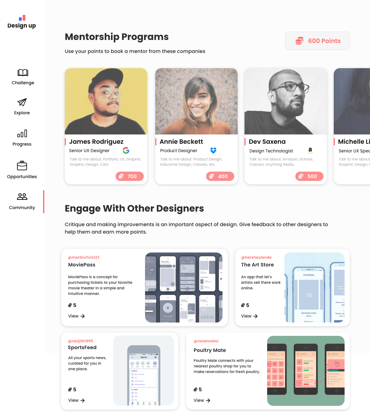 Design up teaches design skills through real-world problems that are broken up into digestible content, which can be accomplished at their own pace. To increase productivity and foster a sense of community, users collect points through various features like giving other app users feedback. The points collected then enable our user to “purchase” a one on one with an industry professional.
